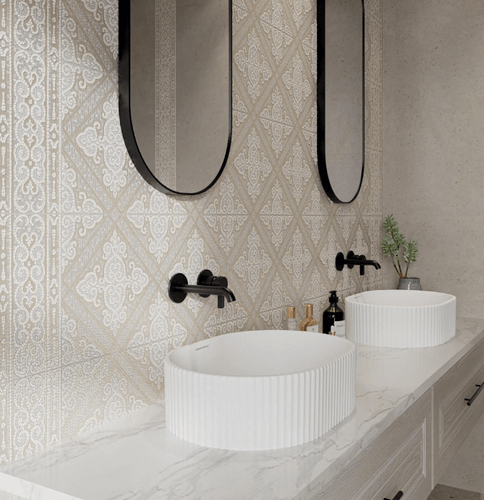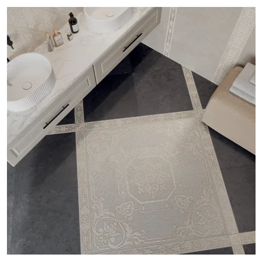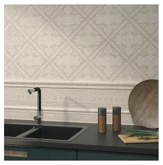 Наряду с фоновой плиткой необычайно легких природных оттенков для отделки стен предлагается плитка с потертым рельефным рисунком. Другой интересный этнический декор, используемый в плитке под мозаику, воспроизводит орнаменты традиционной португальской мостовой «калсада португеза». Узоры «плетёнкой», «волнами», классические цветочные орнаменты складывали из контрастных камней, известняка и гранита.