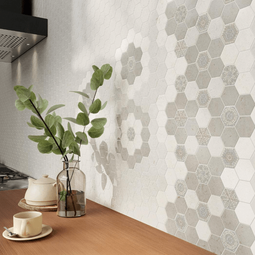 Керамический наборный декор для стен, созданный с использованием технологии гидроабразивной резки, предлагается дополнить вставками художественной мозаики — шестиугольной плиткой в традиционном португальском стиле.