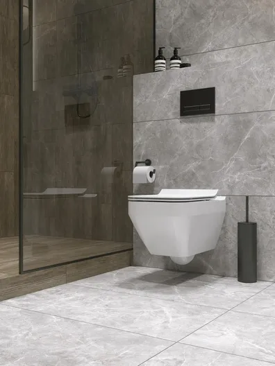 Керамогранит Castello — это реалистичная имитация тёмно-серого камня. Шугар-эффект на поверхности создаёт объём и усиливает натуралистичность покрытия. Керамогранит — идеальное решение для мокрых зон. Этот материал прочен, износостоек, обладает противоскользящим эффектом и не боится влаги. Его можно укладывать вместе с системой «тёплый пол», а уход за ним прост и не требует использования агрессивной бытовой химии.