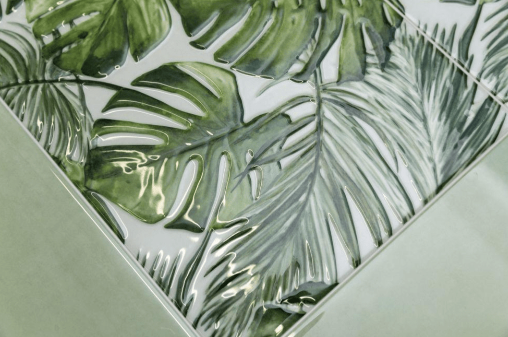 Зелёная плитка — притягательный и сложный отделочный материал, контрастные к ней красные аксессуары рекомендуется использовать по-минимуму. Лучшими сочетаниями станут аналогичные цвета из приглушённых оттенков салатового и жёлтого, а также триада с приглушённым сиреневым и желто-оранжевым. Керамическая плитка 25×40 см с декором тропического леса украсит интерьеры в современном или эко-стиле, будет хорошо сочетаться с сантехникой округлых форм и серебряным блеском смесителей. А чтобы белоснежная сантехника вписалась органично, желательно рядом с ней полосой использовать светло-серую отделку серии «Левада».
