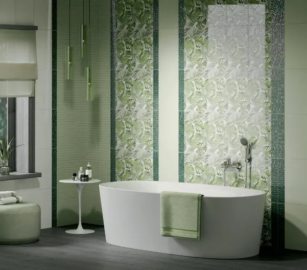 Зелёная плитка — притягательный и сложный отделочный материал, контрастные к ней красные аксессуары рекомендуется использовать по-минимуму. Лучшими сочетаниями станут аналогичные цвета из приглушённых оттенков салатового и жёлтого, а также триада с приглушённым сиреневым и желто-оранжевым. Керамическая плитка 25×40 см с декором тропического леса украсит интерьеры в современном или эко-стиле, будет хорошо сочетаться с сантехникой округлых форм и серебряным блеском смесителей. А чтобы белоснежная сантехника вписалась органично, желательно рядом с ней полосой использовать светло-серую отделку серии «Левада».