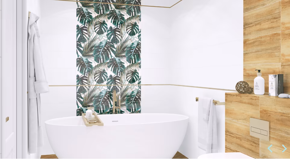 «Парадайс» — путешествие на райские острова. Данный дизайн создаёт впечатление затерянного в джунглях деревянного бунгало, укрывшегося под кружевным пологом экзотических растений. Насыщенная южная зелень панно завораживает богатыми и яркими красками. Эти живописные листья сияют люстром, подчеркнуты бронзовым металликом, а вертикальные глиттерные линии создают иллюзию тропического ливня. Декор дополнен белоснежной базой и плиткой в виде тропического дерева тик, словно согретого жарким солнцем, керамогранитом для пола с текстурой дерева и стильным бордюром Sword Gold.