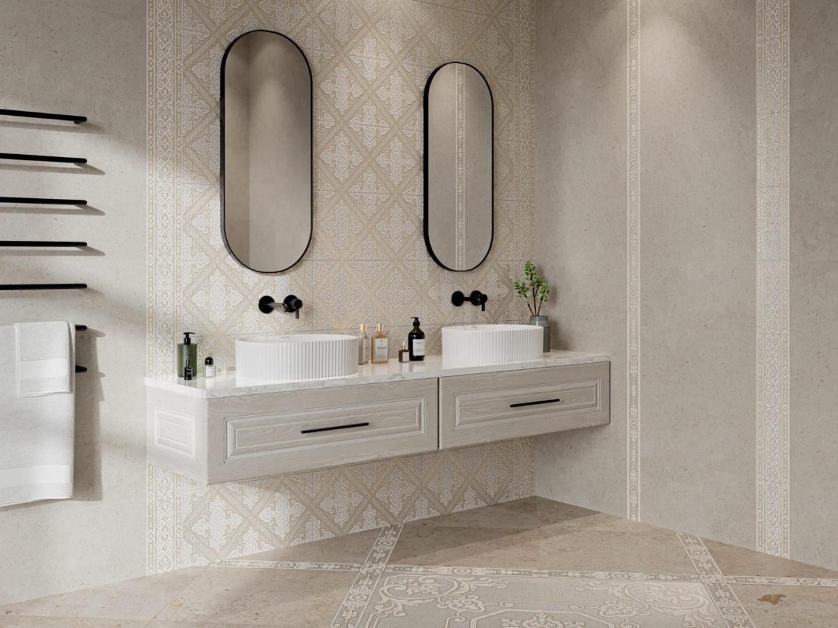 Для напольной укладки предлагается матовый керамический гранит серии Про Лаймстоун светлых оттенков с текстурой известняка.