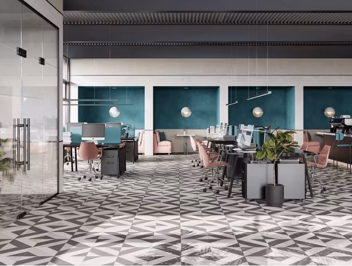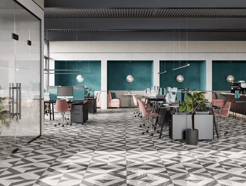Часть керамических материалов выполнена в формате 60×60: здесь также представлены классические узоры и декоративный элемент, геометрический рисунок которого получен из нескольких цветовых вариаций лаймстоуна с помощью гидроабразивной резки. В этом можно увидеть перекличку с историей данного камня, свойства которого позволяли мастерам покрывать его искусной резьбой и использовать в составе наборных элементов.
