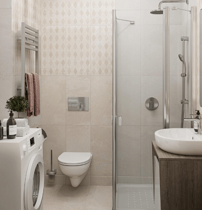 Решения для стены представлены в трех цветах, наиболее популярных для использования в проектах. Это белый, светло-серый и бежевый. В этих цветах выполнена базовая плитка 30×60 с эстетикой камня, а также декоры, где помимо фонового рисунка есть стильный геометрический паттерн. Чтобы сделать линейку настенных материалов более законченной, в неё включены бордюры 30×2,5, плинтус 30×12, в также плитка с выполненной преднарезкой: она делит формат 30×60 на пять частей размером 6×60 см. Это позволяет получить на стене эффект крупной мозаики, укладка которой не требует дополнительных затрат.