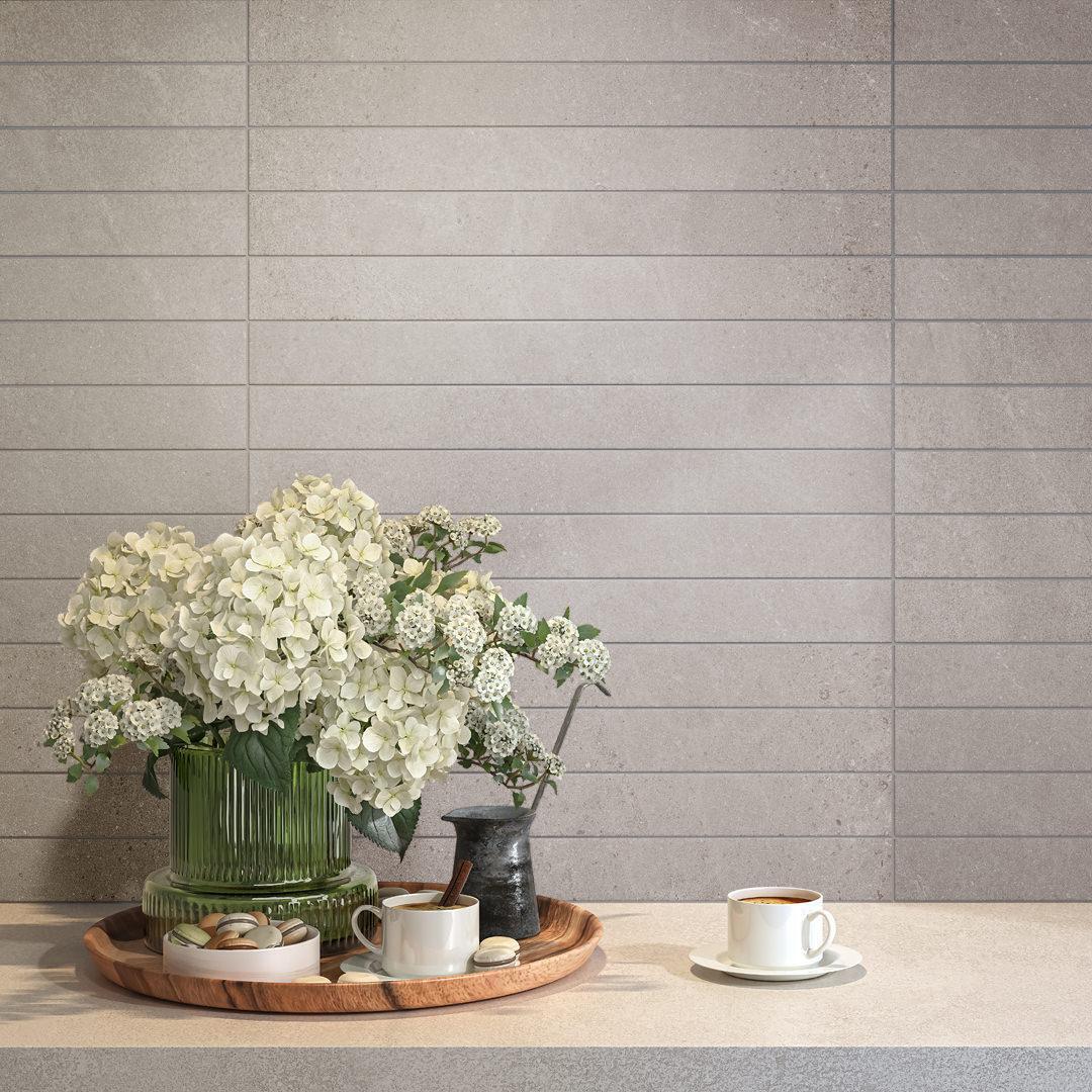 Решения для стены представлены в трех цветах, наиболее популярных для использования в проектах. Это белый, светло-серый и бежевый. В этих цветах выполнена базовая плитка 30×60 с эстетикой камня, а также декоры, где помимо фонового рисунка есть стильный геометрический паттерн. Чтобы сделать линейку настенных материалов более законченной, в неё включены бордюры 30×2,5, плинтус 30×12, в также плитка с выполненной преднарезкой: она делит формат 30×60 на пять частей размером 6×60 см. Это позволяет получить на стене эффект крупной мозаики, укладка которой не требует дополнительных затрат.