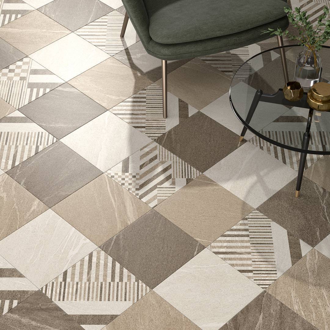 Декоративные элементы с актуальным геометрическим орнаментом сочетают в себе разные оттенки и будут отлично смотреться с базовой плиткой любого цвета.