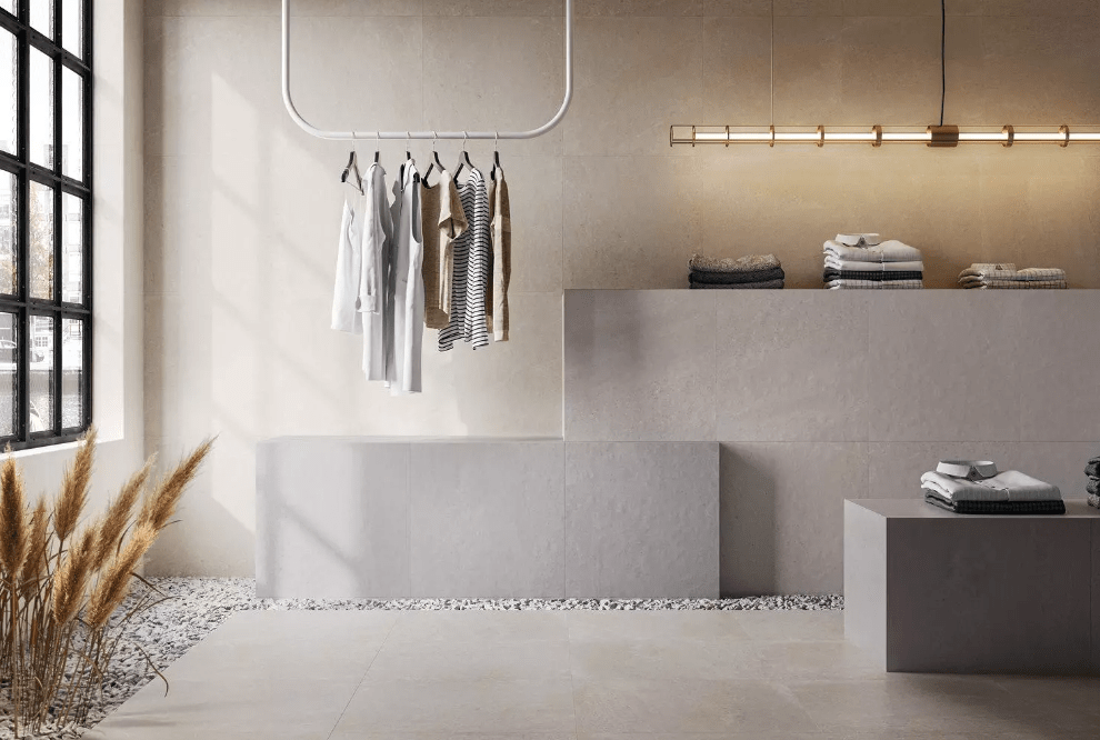 Решения для стены представлены в трех цветах, наиболее популярных для использования в проектах. Это белый, светло-серый и бежевый. В этих цветах выполнена базовая плитка 30×60 с эстетикой камня, а также декоры, где помимо фонового рисунка есть стильный геометрический паттерн. Чтобы сделать линейку настенных материалов более законченной, в неё включены бордюры 30×2,5, плинтус 30×12, в также плитка с выполненной преднарезкой: она делит формат 30×60 на пять частей размером 6×60 см. Это позволяет получить на стене эффект крупной мозаики, укладка которой не требует дополнительных затрат.
