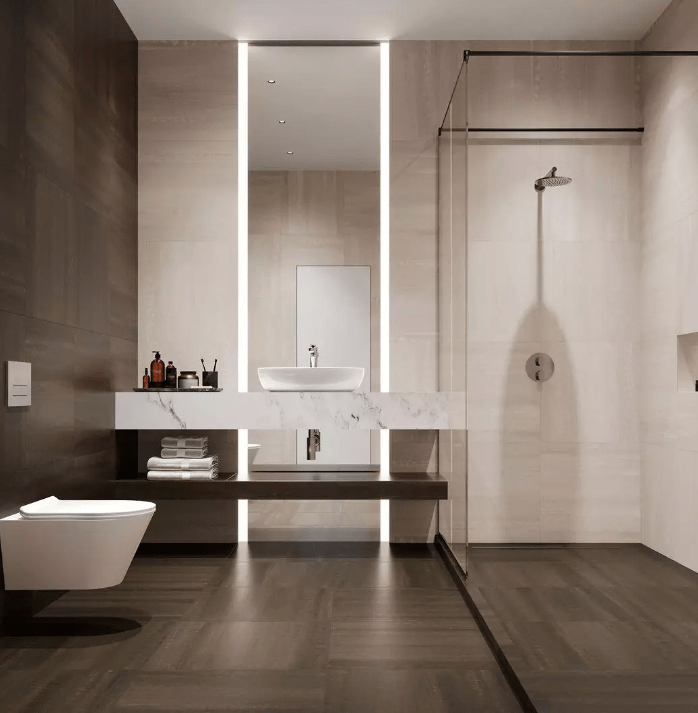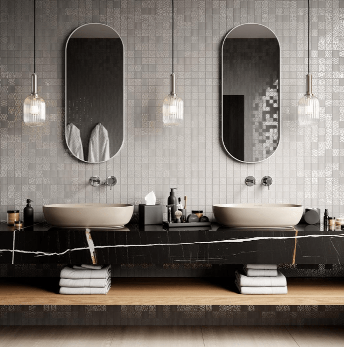 Важно подчеркнуть, что разработанная настенная плитка с точностью до деталей повторяет эстетику керамического гранита тех же серий — визуально и тактильно. Новая настенная плитка, вошедшая в серию «Про Дабл», производится в обрезном формате. Это даёт возможность укладывать её с минимальным швом, создавая эффект единой поверхности.
