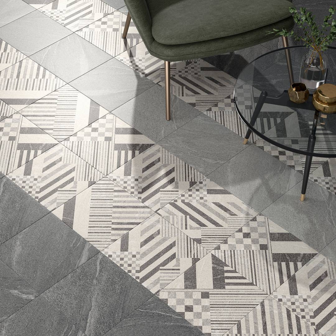 Декоративные элементы с актуальным геометрическим орнаментом сочетают в себе разные оттенки и будут отлично смотреться с базовой плиткой любого цвета.