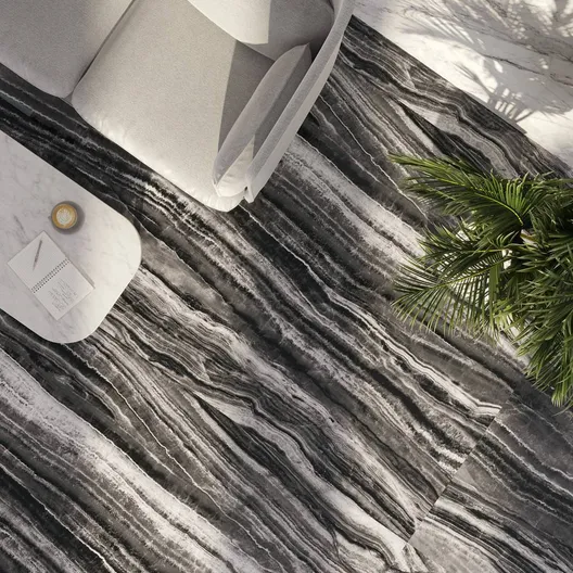 Слоистая текстура натурального оникса достоверно передана в керамическом граните «Гемма». Специфический полосатый окрас минералу придают содержащиеся в слоях примеси. Чёрно-белая гамма — отличительная черта арабского черного оникса. По преданию, этим камнем были украшены трон царя Соломона и стены его храма.