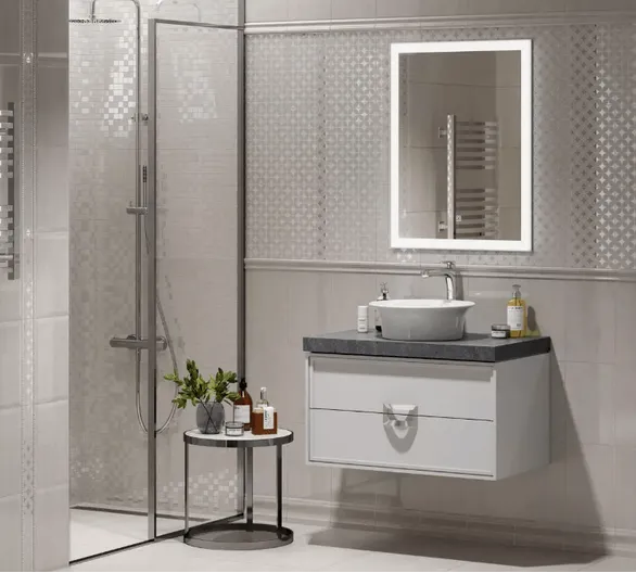 Так как плитка 20×30 см с геометрическим узором из окружностей не содержит в рисунке углов, интерьер будет восприниматься нежным и уютным. Достаточно выложить узором одну из стен или использовать узорчатый керамический гранит 40×40 см в качестве каймы, повторяющей линии периметра пола, но не впритык к стенам, или шахматную укладку, и помещение заиграет искорками глянца. Фрагментарная отделка мозаичным декором внесет ощущение стабильности и порядка. Такая отделка лучше всего подойдёт для интерьеров в современных стилях. Отлично будет сочетаться с мебелью правильных форм, и не только глянцевой, как сама плитка 20×30 см. Если в обстановке присутствует много углов в сантехнике или мебели, выступы стен, декор с окружностями сбалансирует обстановку. А поскольку узор напоминает структуру кристаллической решётки, на его фоне или рядом будут выигрышно смотреться плафоны светильников с рёбрами и гранями, например, напоминающие алмазы. Однотонный текстиль или с похожим узором, с серебряной нитью, добавит гармонии в восприятие интерьера.