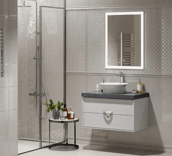 Так как плитка 20×30 см с геометрическим узором из окружностей не содержит в рисунке углов, интерьер будет восприниматься нежным и уютным. Достаточно выложить узором одну из стен или использовать узорчатый керамический гранит 40×40 см в качестве каймы, повторяющей линии периметра пола, но не впритык к стенам, или шахматную укладку, и помещение заиграет искорками глянца. Фрагментарная отделка мозаичным декором внесет ощущение стабильности и порядка. Такая отделка лучше всего подойдёт для интерьеров в современных стилях. Отлично будет сочетаться с мебелью правильных форм, и не только глянцевой, как сама плитка 20×30 см. Если в обстановке присутствует много углов в сантехнике или мебели, выступы стен, декор с окружностями сбалансирует обстановку. А поскольку узор напоминает структуру кристаллической решётки, на его фоне или рядом будут выигрышно смотреться плафоны светильников с рёбрами и гранями, например, напоминающие алмазы. Однотонный текстиль или с похожим узором, с серебряной нитью, добавит гармонии в восприятие интерьера.