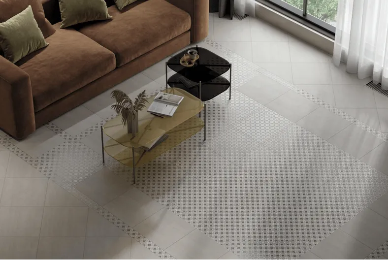 В серии «Туф» для стен предлагается базовая плитка 20×30 см и плитка с геометрическим узором, составленным из пересекающихся окружностей, в качестве компаньона — глянцевый мозаичный декор. В серию также входит напольный керамический гранит 40×40 см: базовый и с геометрическим узором. Возможности напольной укладки керамического гранита дополняет бордюр 40,2×7,7 см и вставка 7,7×7,7 см. Вся плитка исполнена в одном цвете на блестящей глазури. Текстура напоминает седоватый травертин — разновидность туфа, который украсит пространство нотками роскоши.