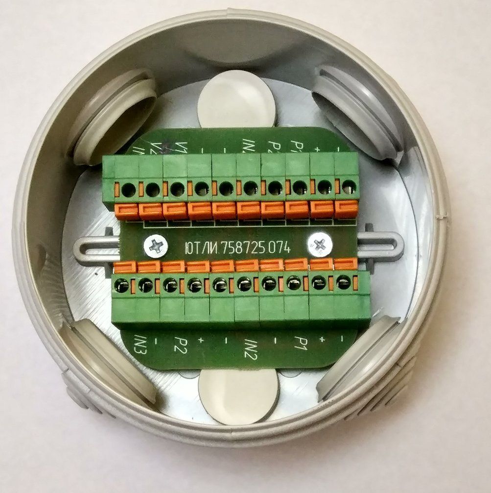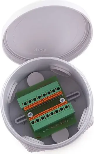 Устройство изготавливается в виде небольшой коробки с клеммными колодками для скрытого монтажа. Пластиковый корпус имеет четыре отверстия с резиновыми уплотнителями для вывода кабелей и завинчивающуюся крышку. Конструкция герметичная, клеммы обеспечивают надежный контакт без утяжки за счет подпружинивания. Блоки очень просты и удобны в монтаже, предоставляют хороший доступ ко всем элементам для изменения коммутации при необходимости.