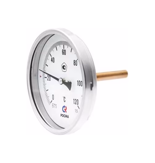 (БТ-51) Погружной биметаллический термометр для измерения температуры жидкостей и газов. При оснащении гильзой из нержавеющей стали может использоваться в системах с агрессивной средой. Корпус выполнен из стали. Диаметр корпуса – 100 мм. Класс точности – 1,5. Диапазон измерений – от 0 до 120 или 160 °С. Максимальное рабочее давление (на гильзе) – 2,5 МПа. Подключение – осевое (заднее). Резьба присоединения на гильзе – ½".