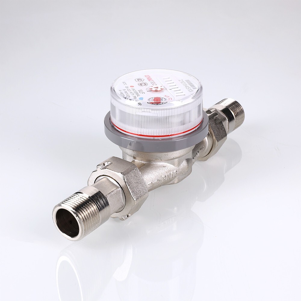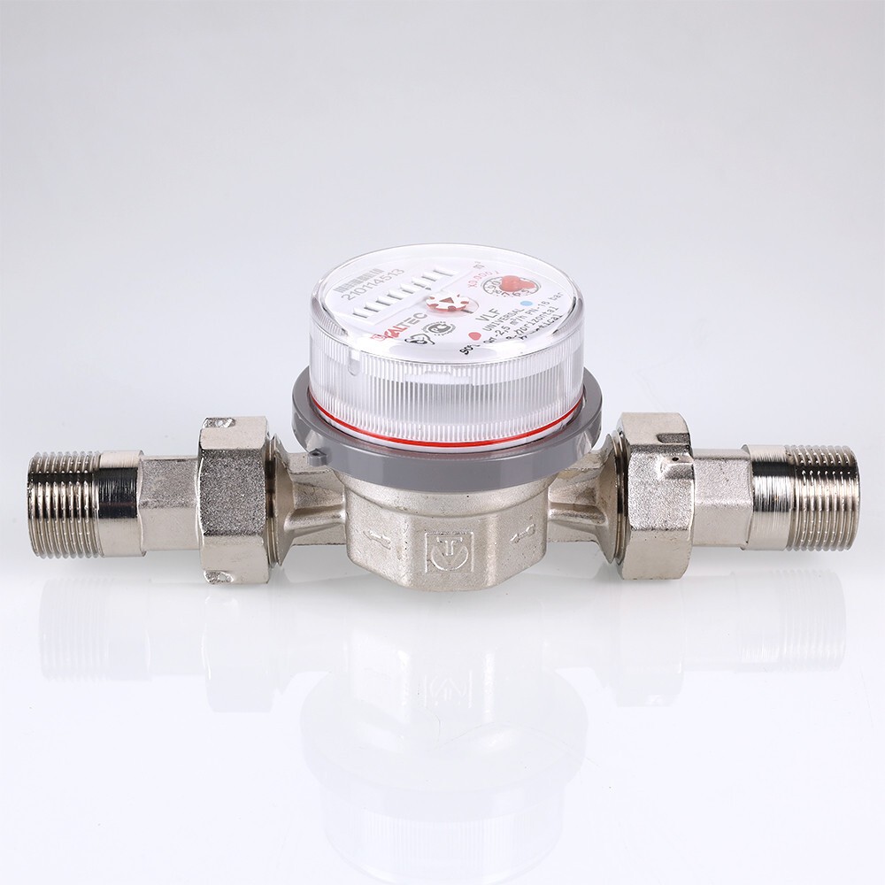 Водосчетчик универсальный – для измерения расхода холодной и горячей воды, главным образом – в квартирах. Условный диаметр модели – 3/4"; номинальный расход воды – 2,5 куб. м/ч. Длина прибора без сгонов – 105 мм. Резьба присоединительных патрубков – 1".