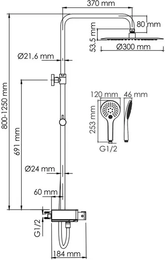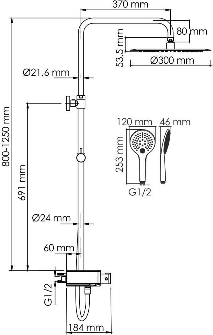 - душевая лейка, верхний душ, термостат, держатель душевой лейки, душевой шланг