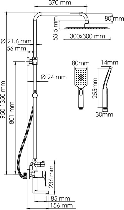 - душевая лейка, верхний душ, держатель душевой лейки, душевой шланг, смеситель