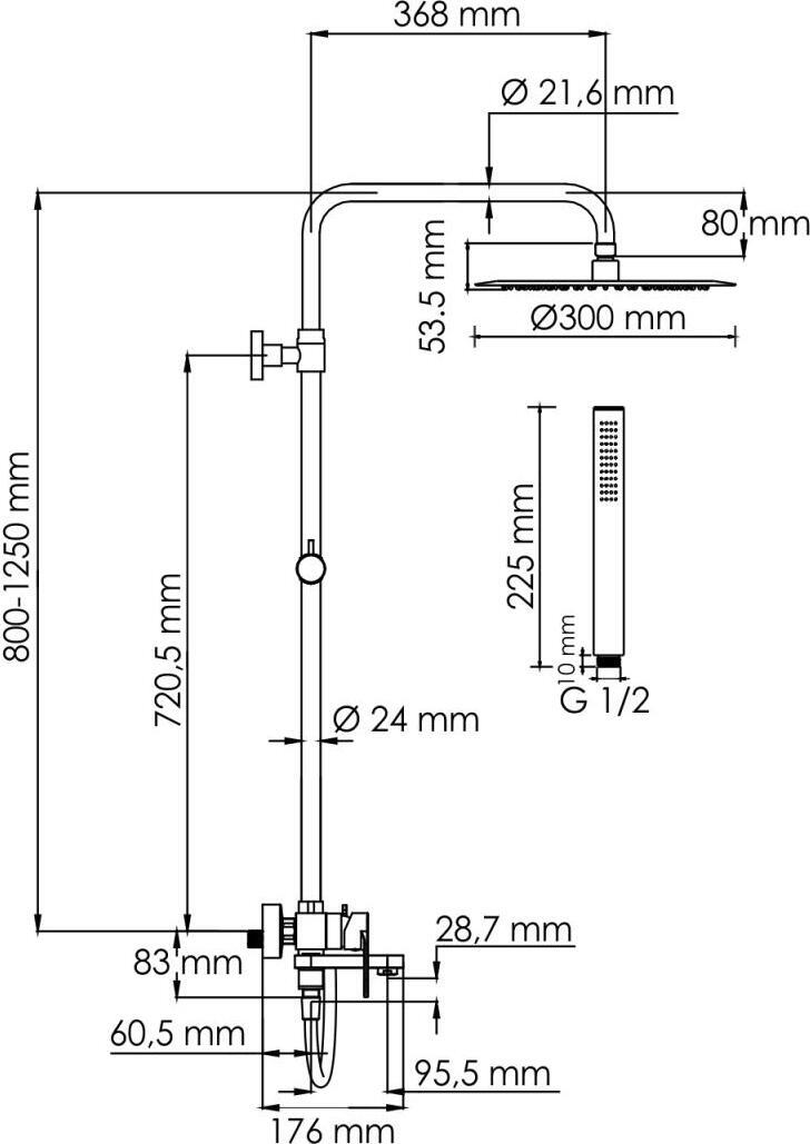 - душевая лейка, душевая штанга, верхний душ, держатель душевой лейки, душевой шланг, смеситель