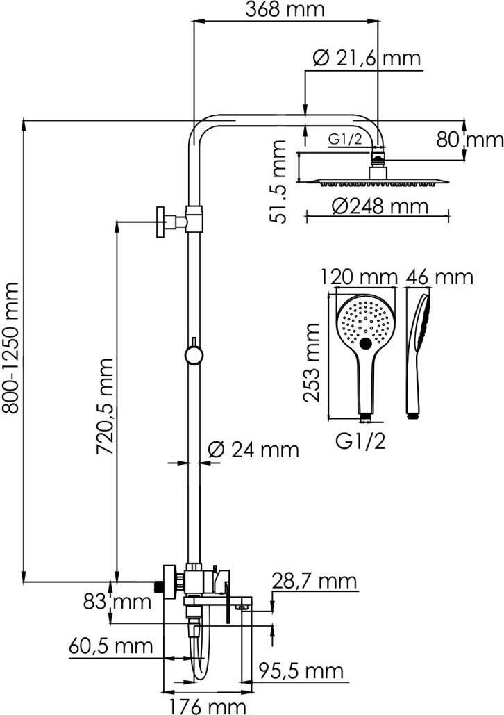 - душевая лейка, душевая штанга, верхний душ, держатель душевой лейки, душевой шланг, смеситель