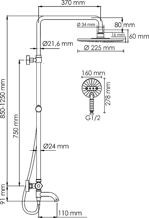 - душевая лейка, душевая штанга, верхний душ, термостат, держатель душевой лейки, душевой шланг