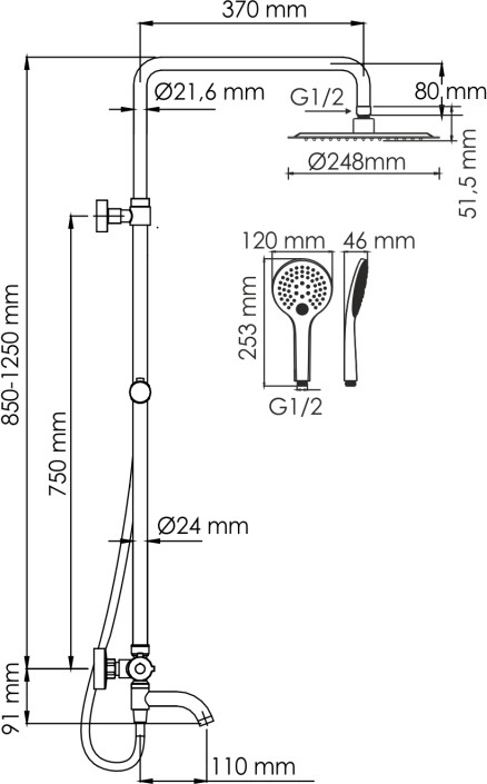 - Стойка для душа, Ø 22 мм регулируемая по высоте