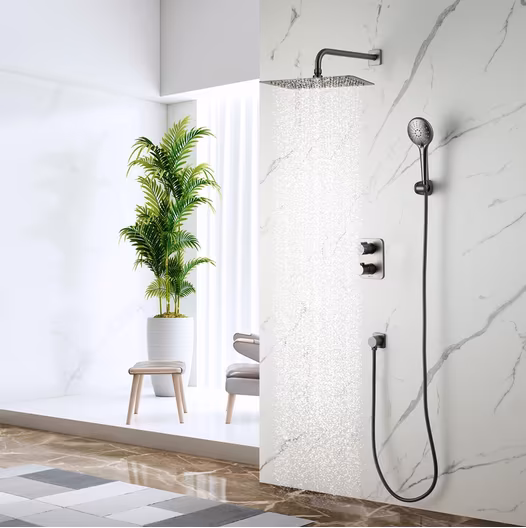 - душевая лейка, верхний душ, термостат, держатель душевой лейки, душевой шланг