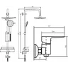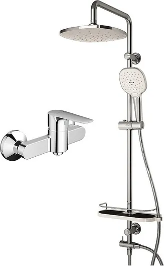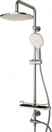 - душевая лейка, душевая штанга, полочка, верхний душ, держатель душевой лейки, душевой шланг, смеситель