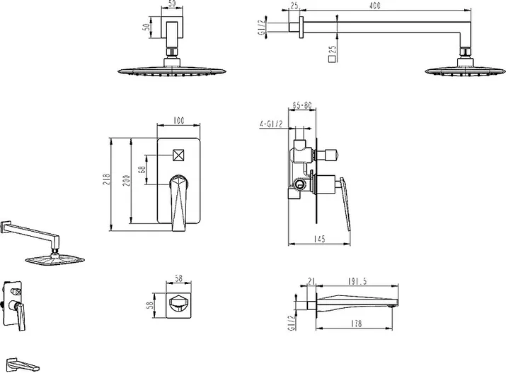 - душевая лейка, верхний душ, излив, держатель душевой лейки, душевой шланг