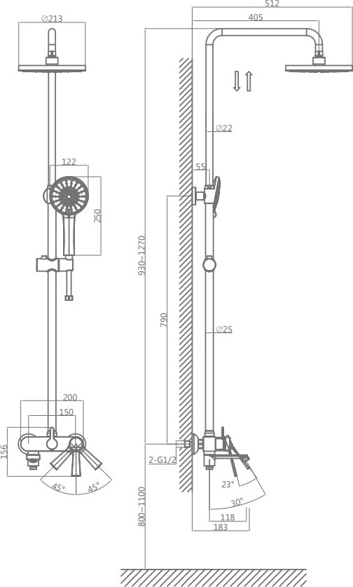 - душевая лейка, верхний душ, держатель душевой лейки, душевой шланг, смеситель