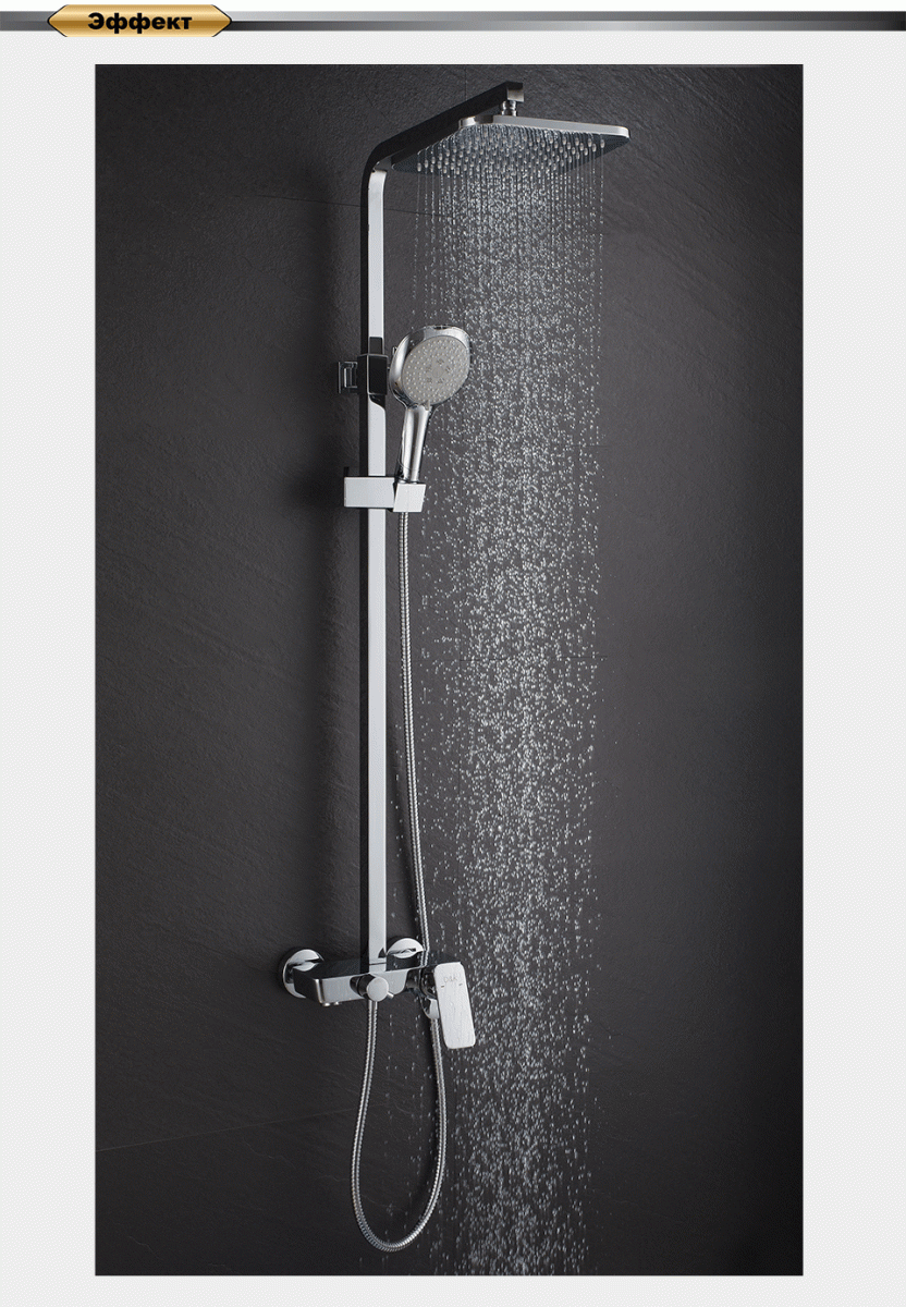 Функциональная душевая система с широкой лейкой, с эффектом настоящего тропического ливня. Штанга регулируется под любой рост.