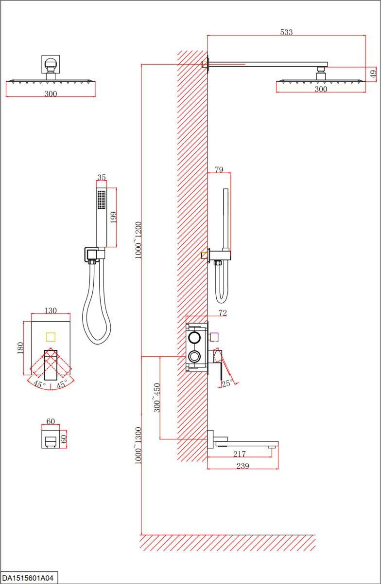 - душевая лейка, верхний душ, держатель душевой лейки, душевой шланг, смеситель
