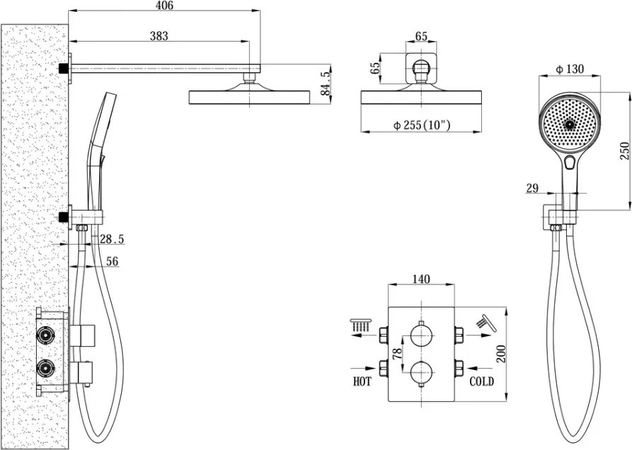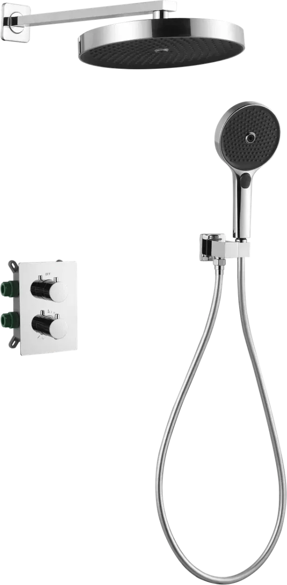 - душевая лейка, верхний душ, держатель душевой лейки, душевой шланг, смеситель