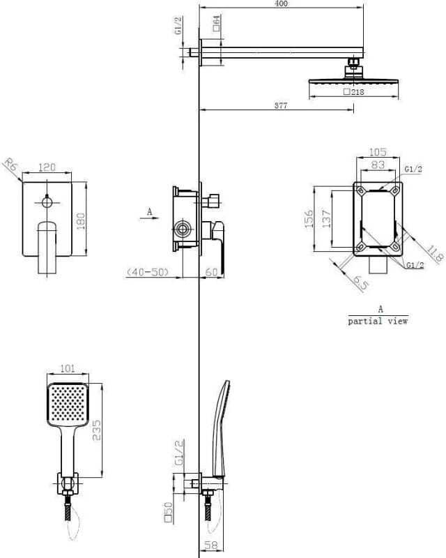 - душевая лейка, верхний душ, держатель душевой лейки, душевой шланг, смеситель