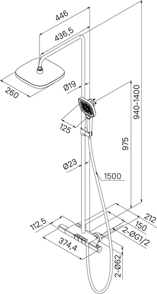 - душевая лейка, душевая штанга, верхний душ, держатель душевой лейки, душевой шланг, смеситель