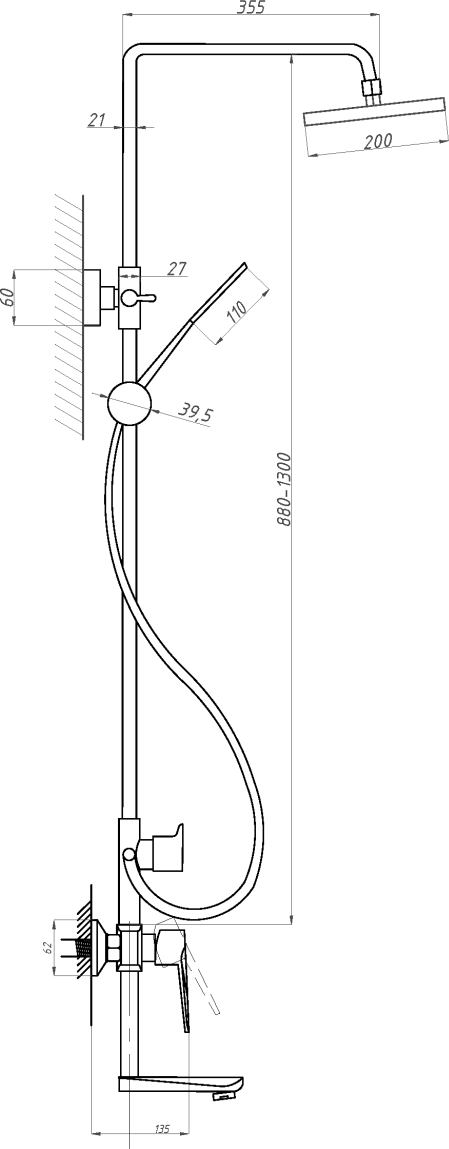 - душевая лейка, верхний душ, держатель душевой лейки, душевой шланг