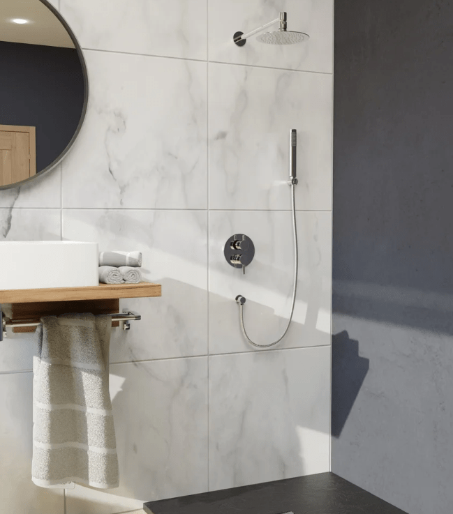 - душевая лейка, верхний душ, держатель душевой лейки, душевой шланг, смеситель