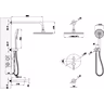 - душевая лейка, скрытая монтажная часть, верхний душ, излив, держатель душевой лейки, душевой шланг, смеситель