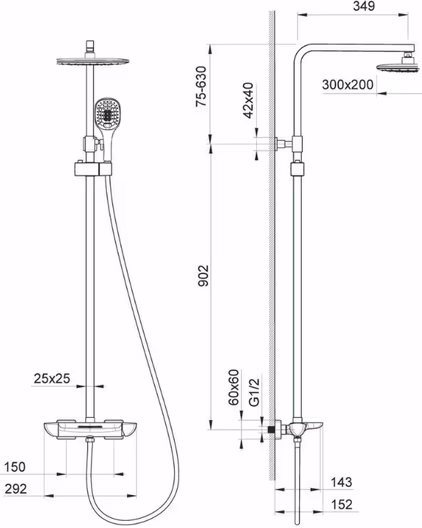 - душевая лейка, верхний душ, держатель душевой лейки, душевой шланг, смеситель