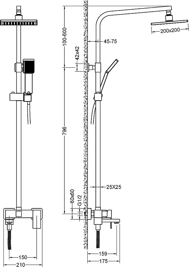 - душевая лейка, верхний душ, держатель душевой лейки, душевой шланг, смеситель