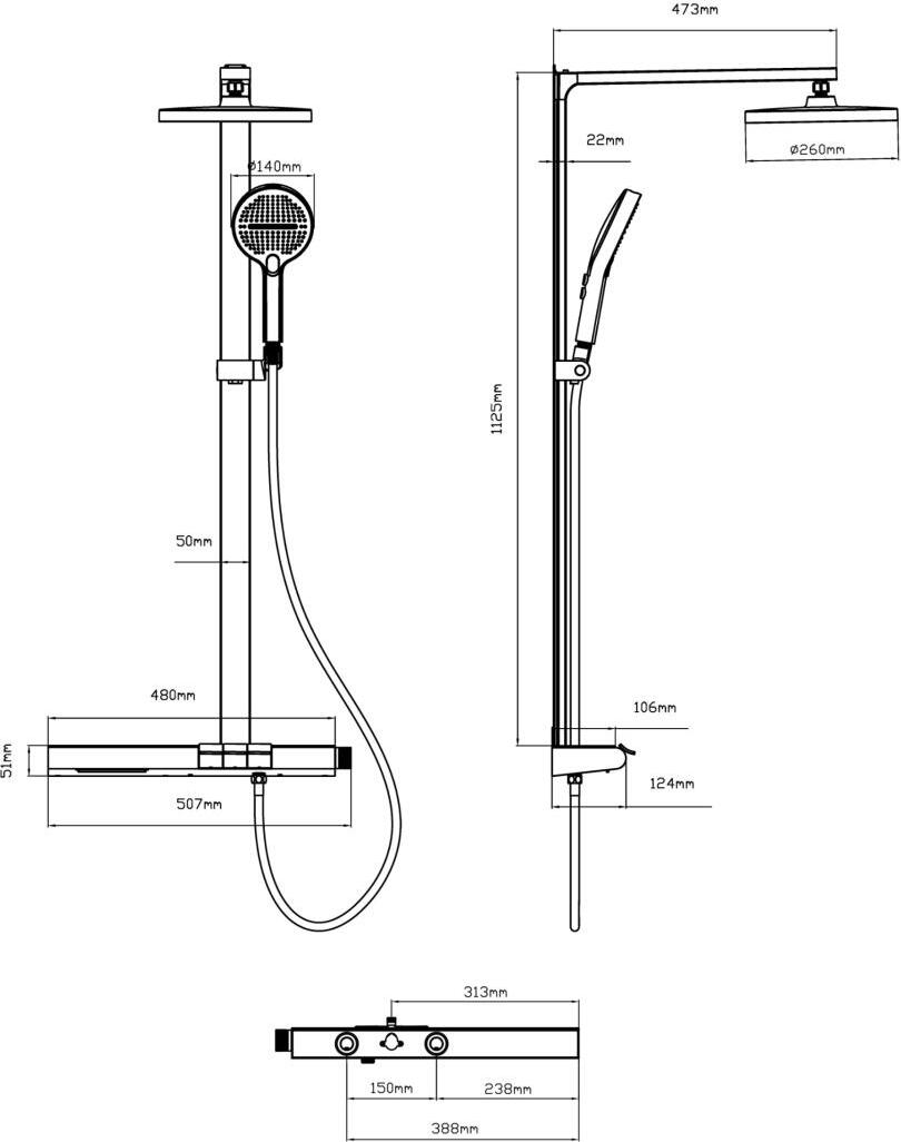 - душевая лейка, верхний душ, держатель душевой лейки, душевой шланг, смеситель