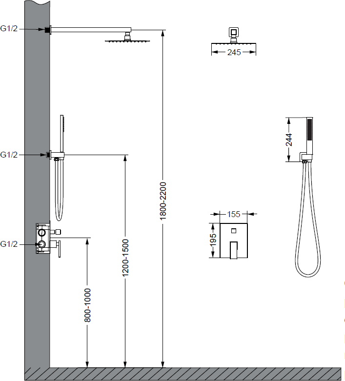 - душевая лейка, скрытая монтажная часть, верхний душ, держатель душевой лейки, душевой шланг, смеситель