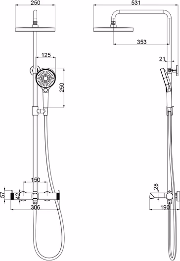 - душевая лейка, верхний душ, держатель душевой лейки, душевой шланг, смеситель