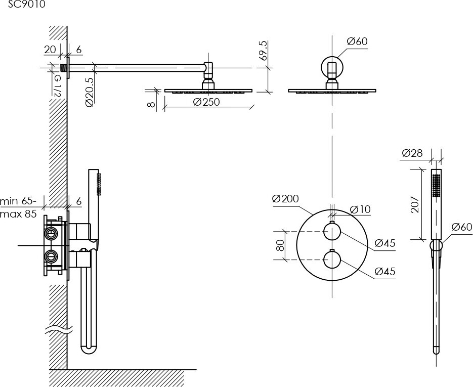 - Верхний душ из нержавеющей стали , Ø250 мм, с возможностью регулировки угла наклона