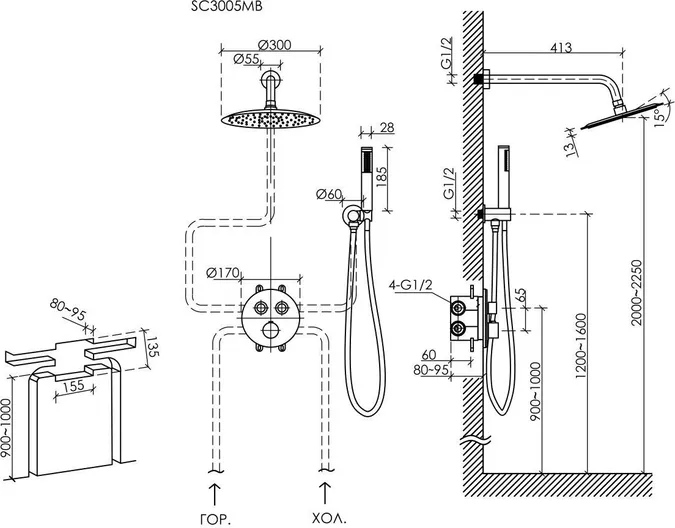 - душевая лейка, верхний душ, держатель душевой лейки, душевой шланг