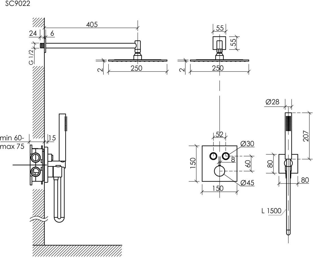 - Верхний душ 250x250 мм, с возможностью регулировки угла наклона