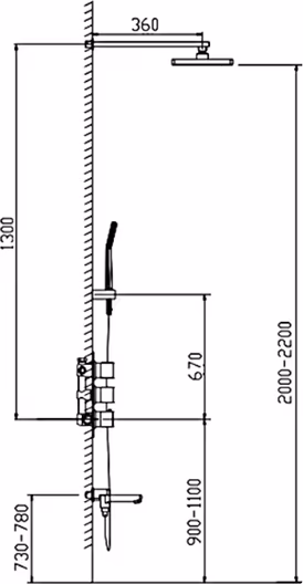 - душевая лейка, скрытая монтажная часть, верхний душ, излив, держатель душевой лейки, душевой шланг, смеситель