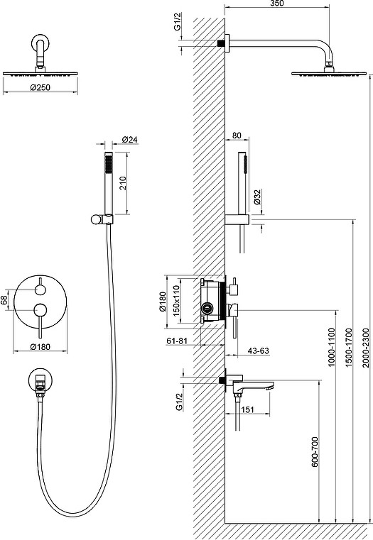 - душевая лейка, верхний душ, излив, душевой шланг, смеситель
