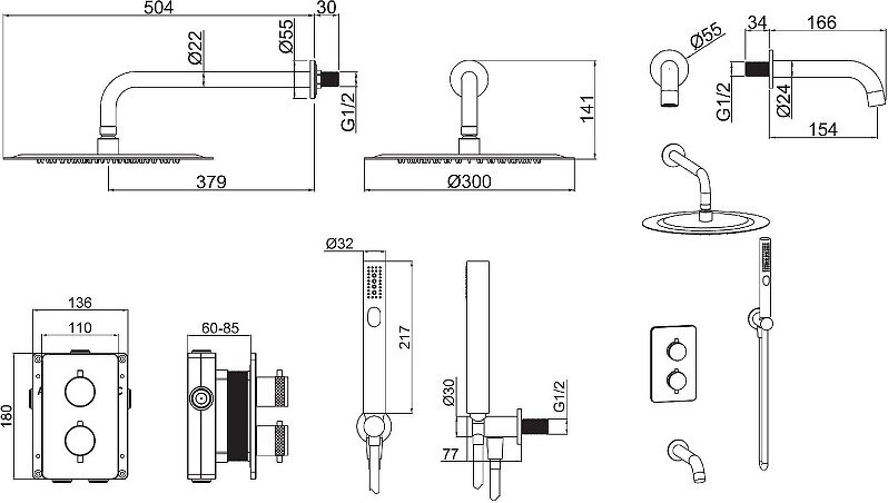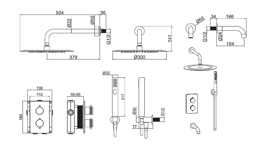 - душевая лейка, шланговое подключение, верхний душ, излив, держатель душевой лейки, душевой шланг, смеситель